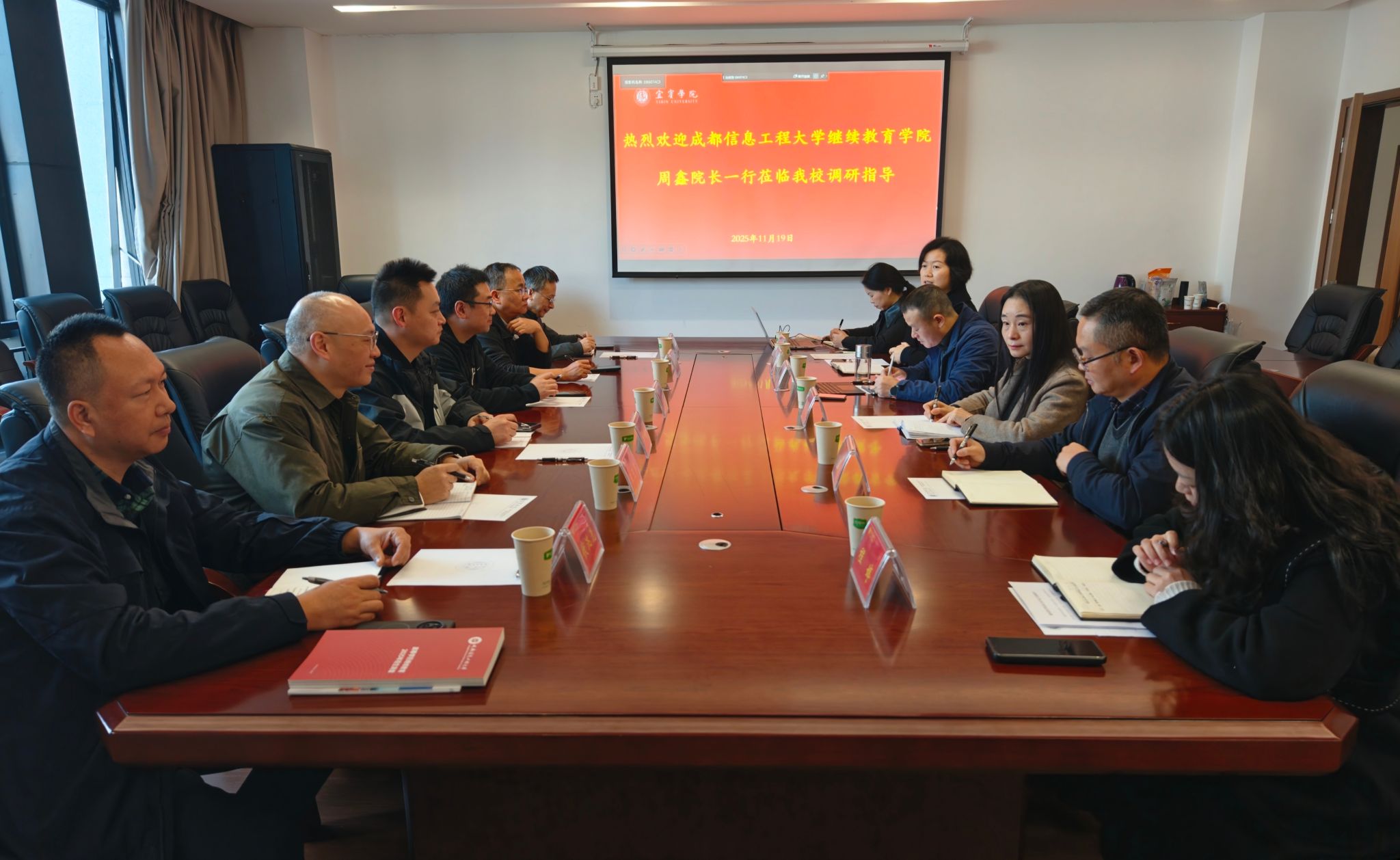 2025年11月19日,成都信息工程大学继续教育学院院长周鑫率队莅临我校,就自考办学、非学历教育培训等继续教育领域核心工作开展专题调研与合作洽谈。我校分管副校长覃凤清热情接待了调研团队,组织部、人事处、计划财务处、校地合作处及继续教育学院相关负责人陪同交流并出席座谈会。